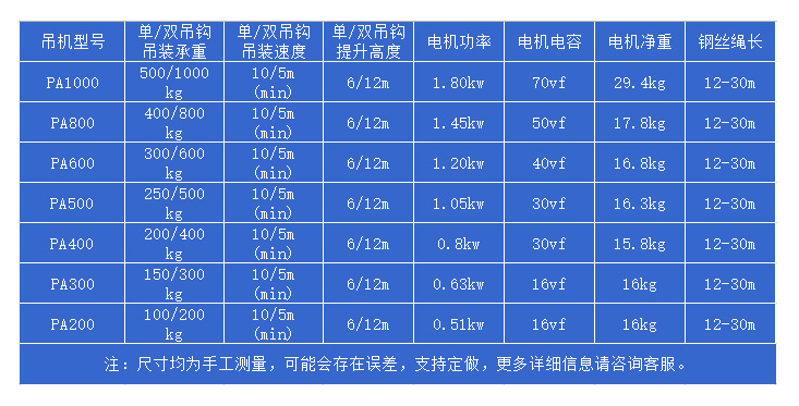 PA200微型電動葫蘆又叫家用微型電動葫蘆、民用電動葫蘆,其外形小巧便攜,安裝簡單方便,噪音小,家用電220V即可操作;搭配電動跑車實現工字鋼上的左右運行;微型電動葫蘆有急停限位安全裝置,使用安全可靠。
